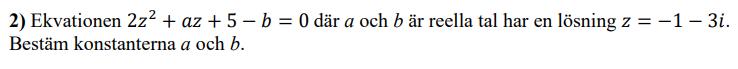 Eftersom alla koefficienter i -ekvationen är reella och vi har en komplex lösning vet vi att lösningens konjugat också löser -ekvationen. Sätter man in den på samma sätt som du gjorde får man ekvationen: