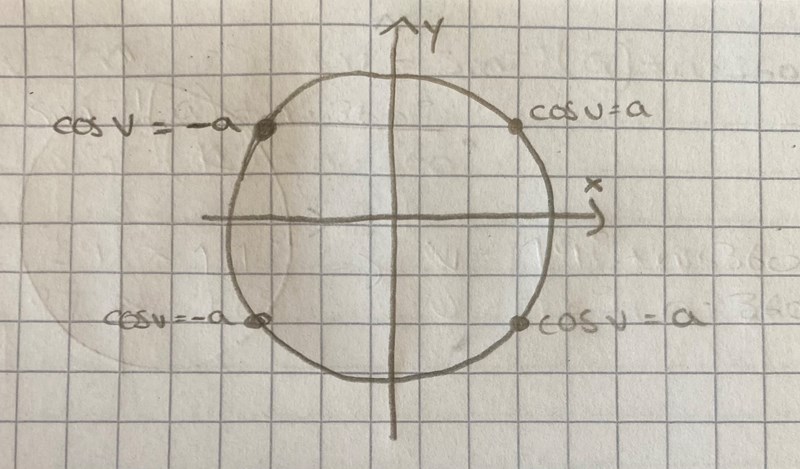 0° ≤ v ≤ 360°. Ange lösningarna till ekvationen cos v = -a och uttryck lösningarna i v1.