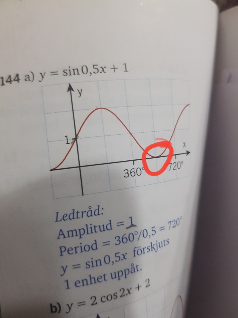 Jag burukar alltid att skissa den orginalet graf först, alltså sin0,5. Då hittar jag att grafen skär x-axel i punkten 360 grader. Men efter att grafen förskjuts 1 enhet uppåt blir skärnings punkt 480 grader. Värfor förskjuts det åt höger och inte är 360 grader längre?