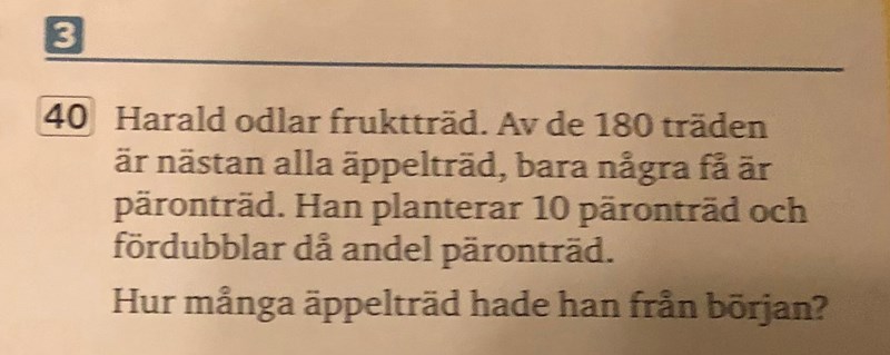 alltså betyder det att det fanns 10 päronträd från början, och det blev 20 nu. Så svaret på frågan är 180 - 10 = 170. Det fanns 170 äppelträd från början.