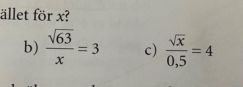 Prova att kvadrera båda sidor på b-uppgiften 63=3x 632=3x2