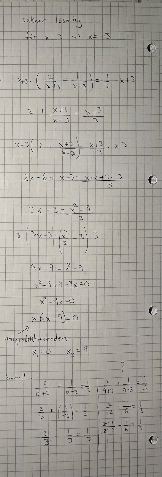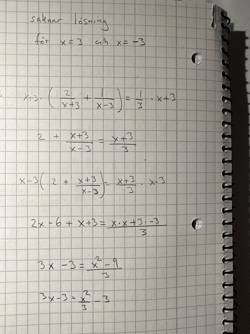 Det enda jag saknar är parenteser runt faktorerna x+3 och x-3 när du multiplicerar med dem.