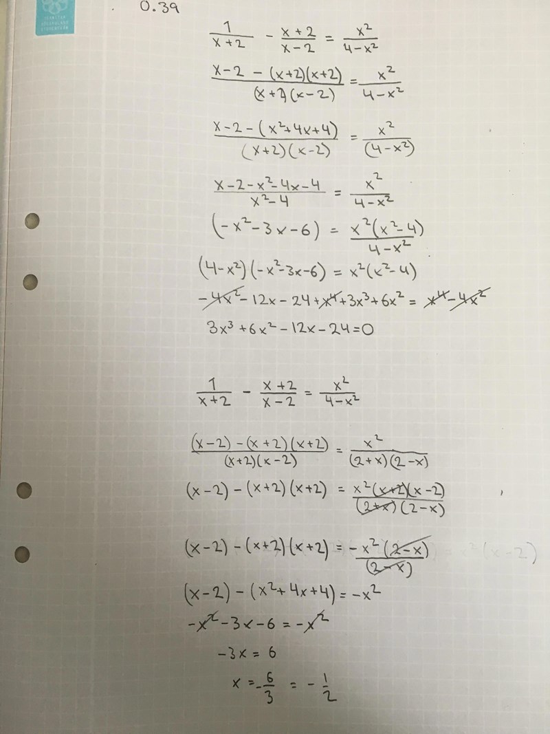 Sista raden i din sista lösning är ju fel. Du får x=-2 (inte -1/2), men x=-2 kan vi inte tillåta då originaluttrycket inte är definierat för x=-2.