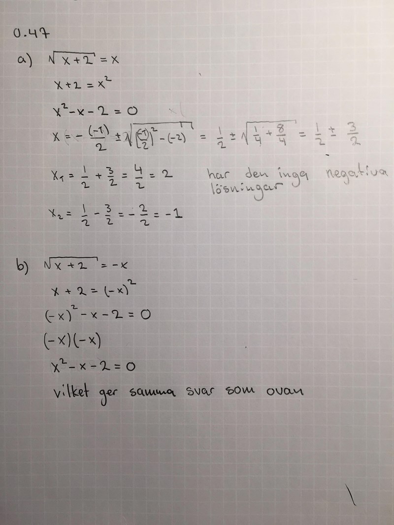 hej, testa dina lösningar, stoppa in i den andra ekvationen lösningarna från a och se om det verkligen är samma svar. :)