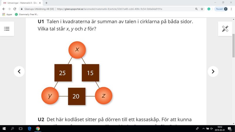 Korra skrev:Yassi4 skrev:Talen i kvadraterna är summan av talen i cirklarna på båda sidor. Vilka tal står x, y och z för?