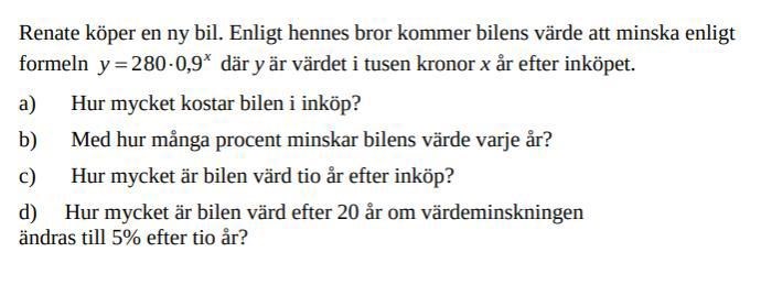 På (d) kan du bara fortsätta från den du fick fram i (c). Du har räknat vad bilen är värd efter 10 år. Du har funktionen: f(x) = 280•0,9^x och istället för 0,9 så blir förändringsfaktorn 0,95, alltså 5% värdeminskning/år. Beräkna mha f(x) = 280•0,95^x vad bilen är värd efter 10 år.