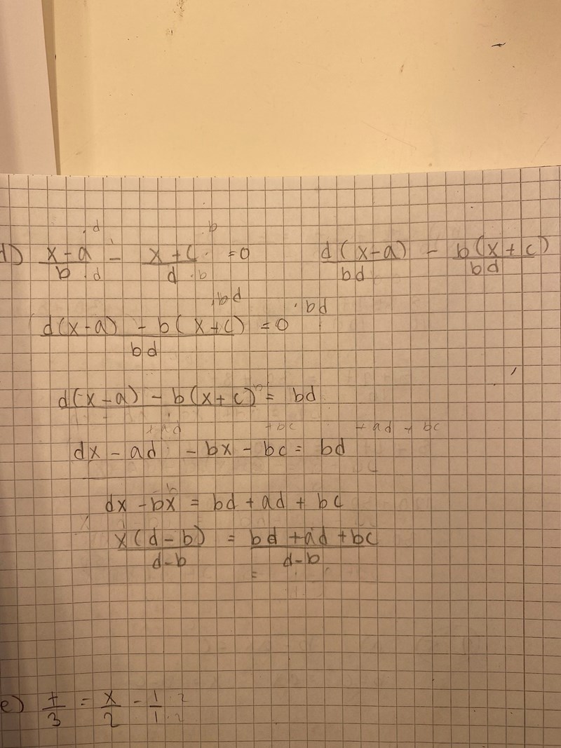 Tips: Du har gjort fel på rad 3 när du multiplicerar båda sidor men nämnaren bd. I högerledet blir det då 0•bd, vilket är något helt annat än det du har skrivit.