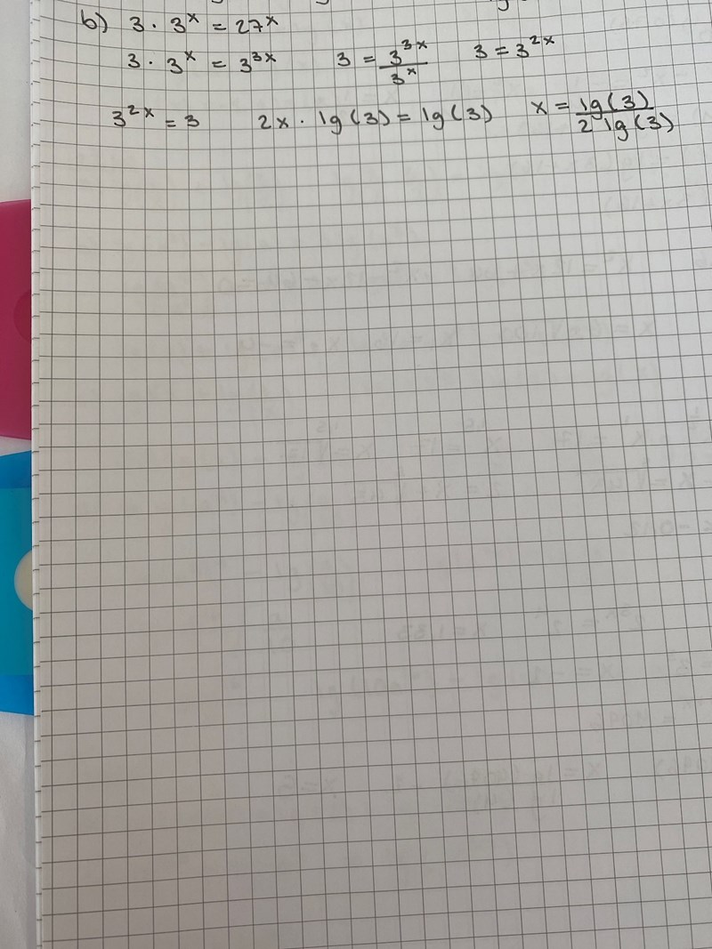 Hej! Jag håller på att försöka lösa en uppgift där jag ska använda mig av logaritmer, men jag har en okänd exponent i båda leden. Uppgiften är: