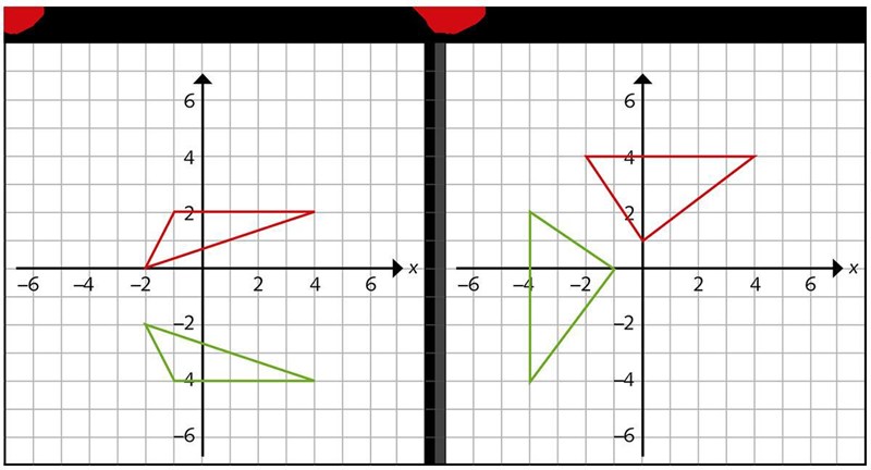 Den gröna triangeln är en spegelbild av den röda triangeln. Vilken ekvation har linjen som triangeln har speglats i?