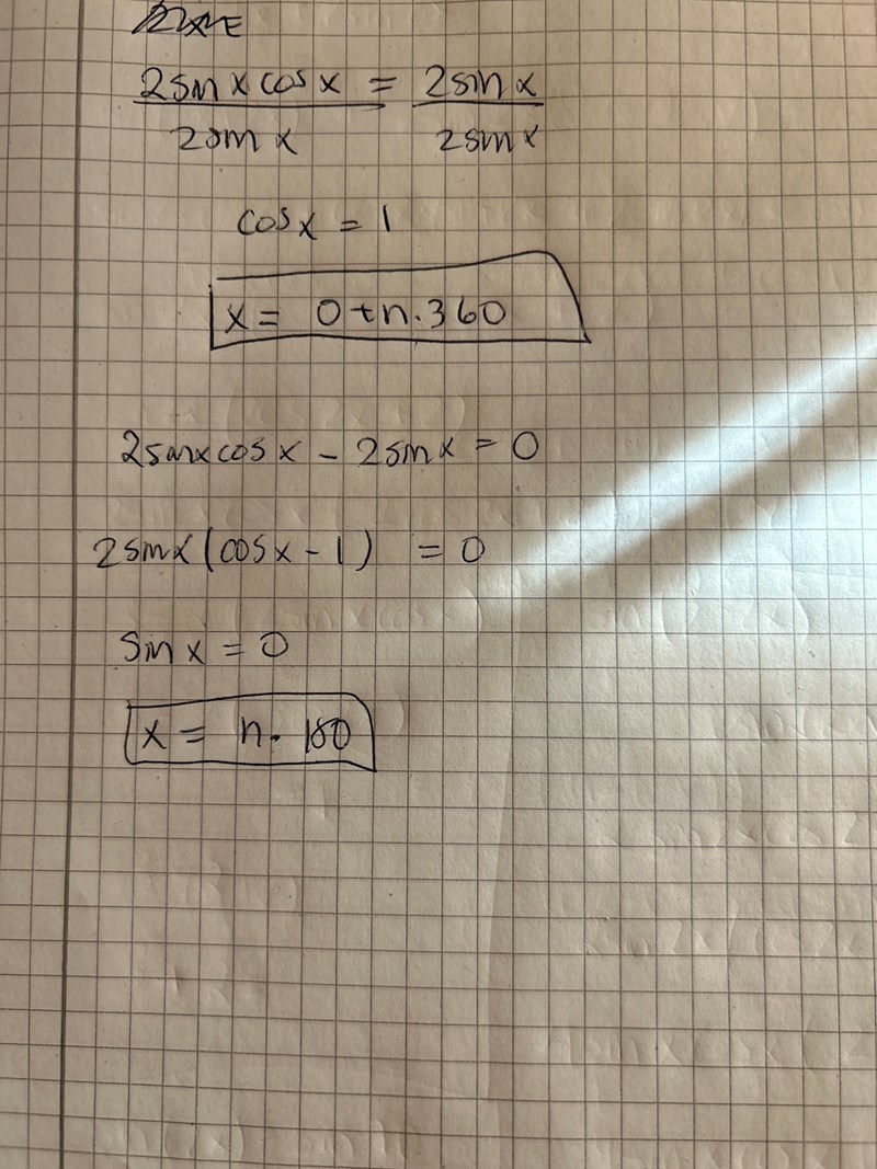 Ture skrev:Det du gör på första raden är farligt, du delar med sin(x) som är 0 för vissa värden på x. Du tappar då bort de lösningar där sin kan vara 0 och får bara fram de lösningar där cos = 0.