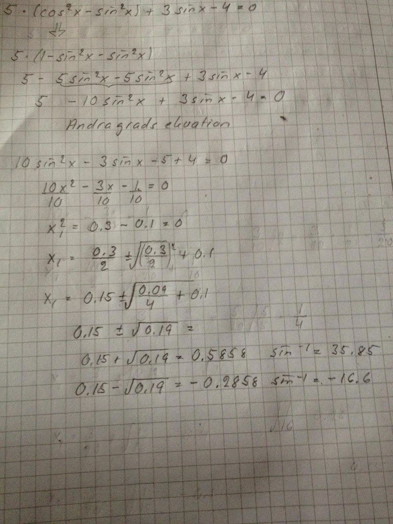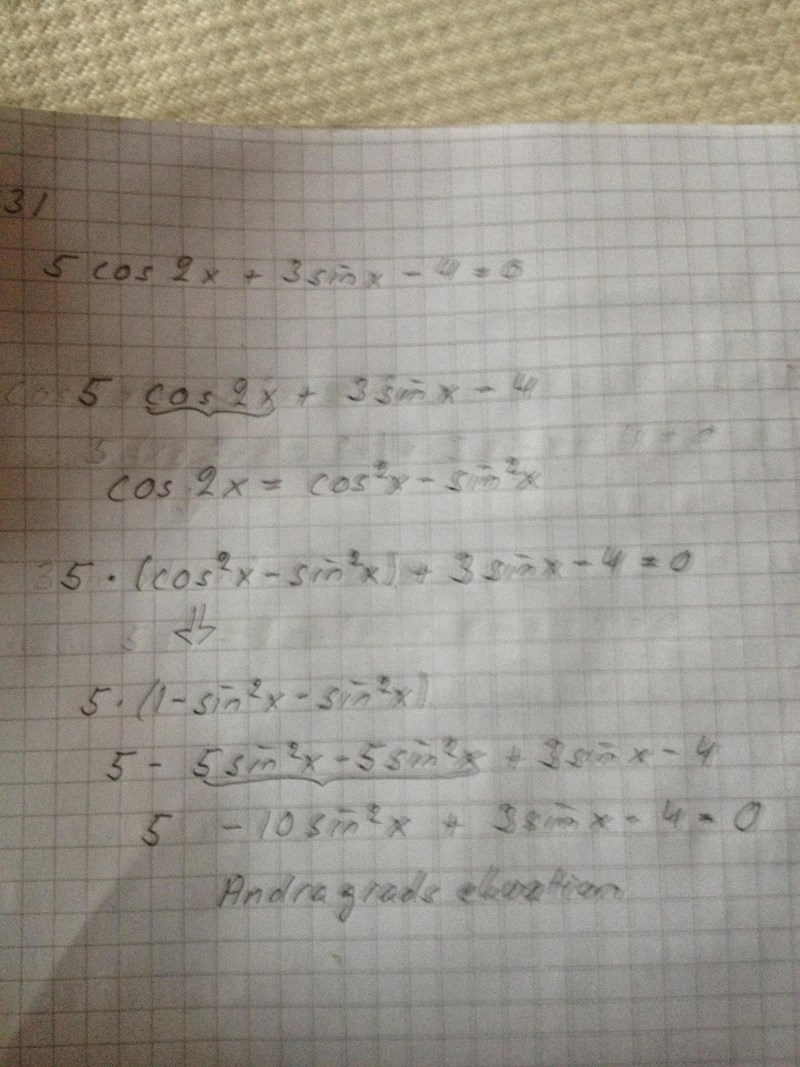 5* (cos ^2(x) - sin ^2(x) ) + 3 sin(x) - 4= 0