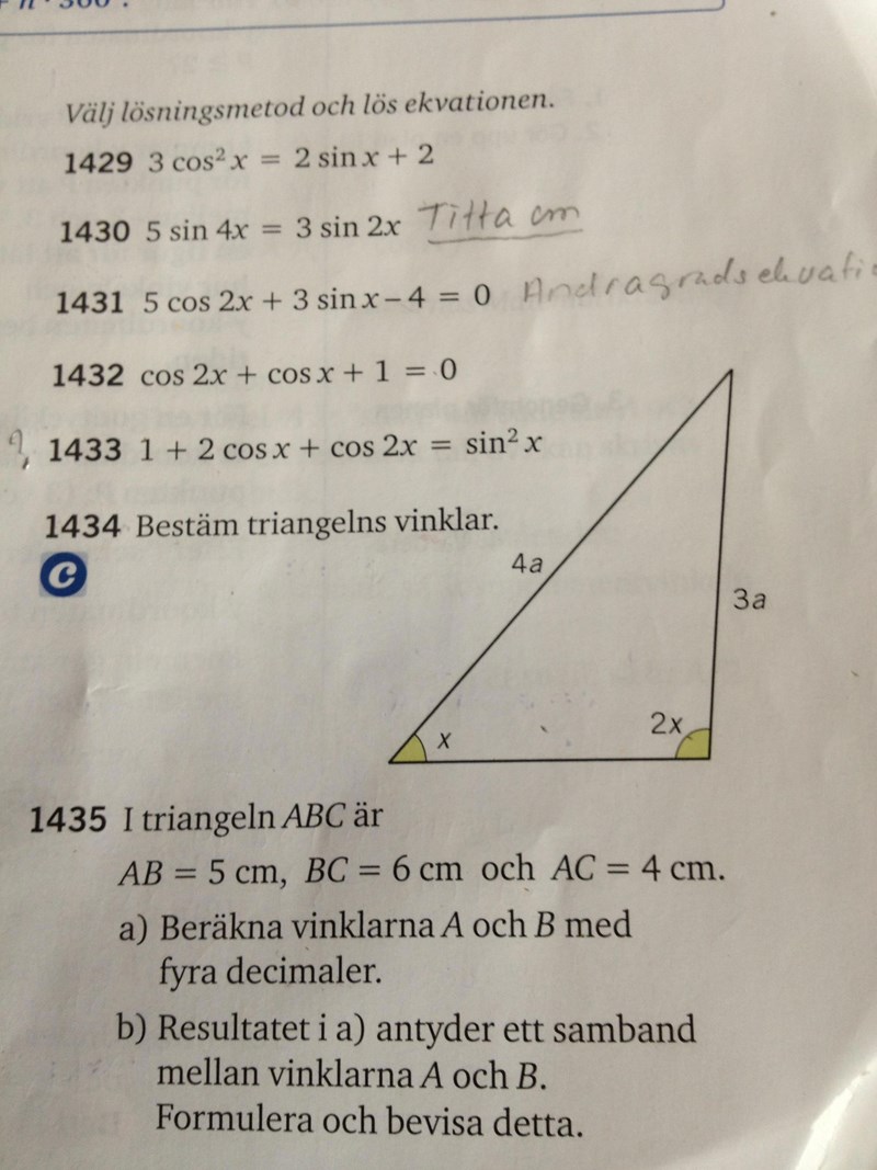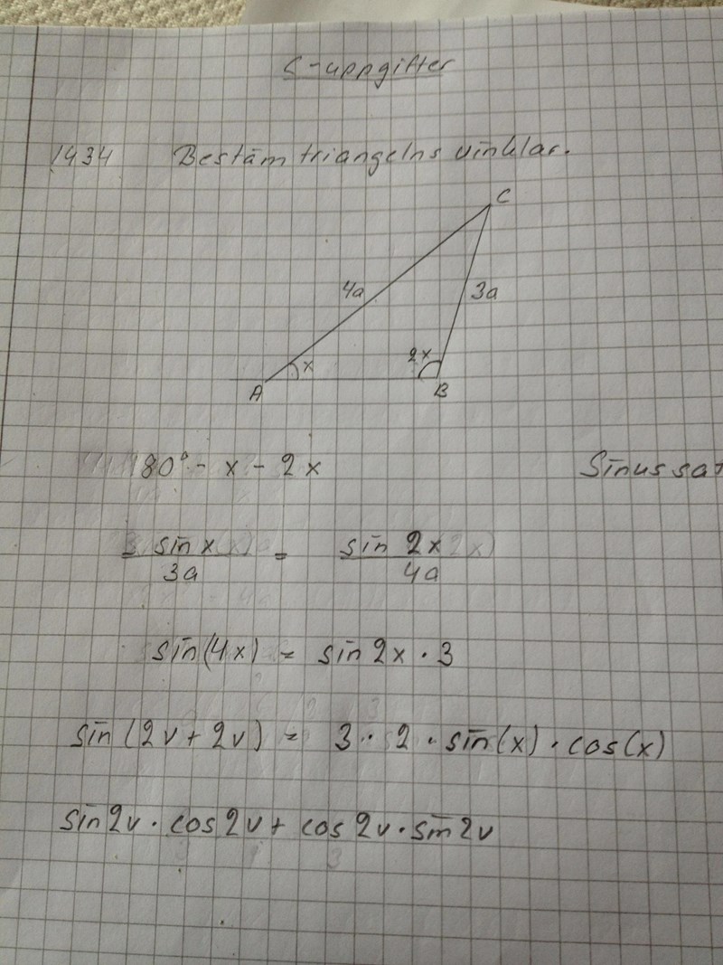 Sinussatsen säger att sin(x)/(3a) = sin(2x)/(4a). Detta ger alltså att