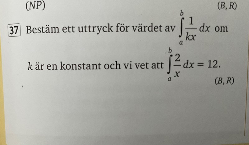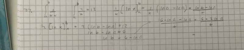 Hittills har jag kommit fram till att ln b= 6- ln a, mha den andra integralen. I facit blir svaret 6/k, jag antar att ln a=0? Eftersom jag fick fram ekvationen: (ln b - ln a)/k, när jag fortsatte på den första integralen.
