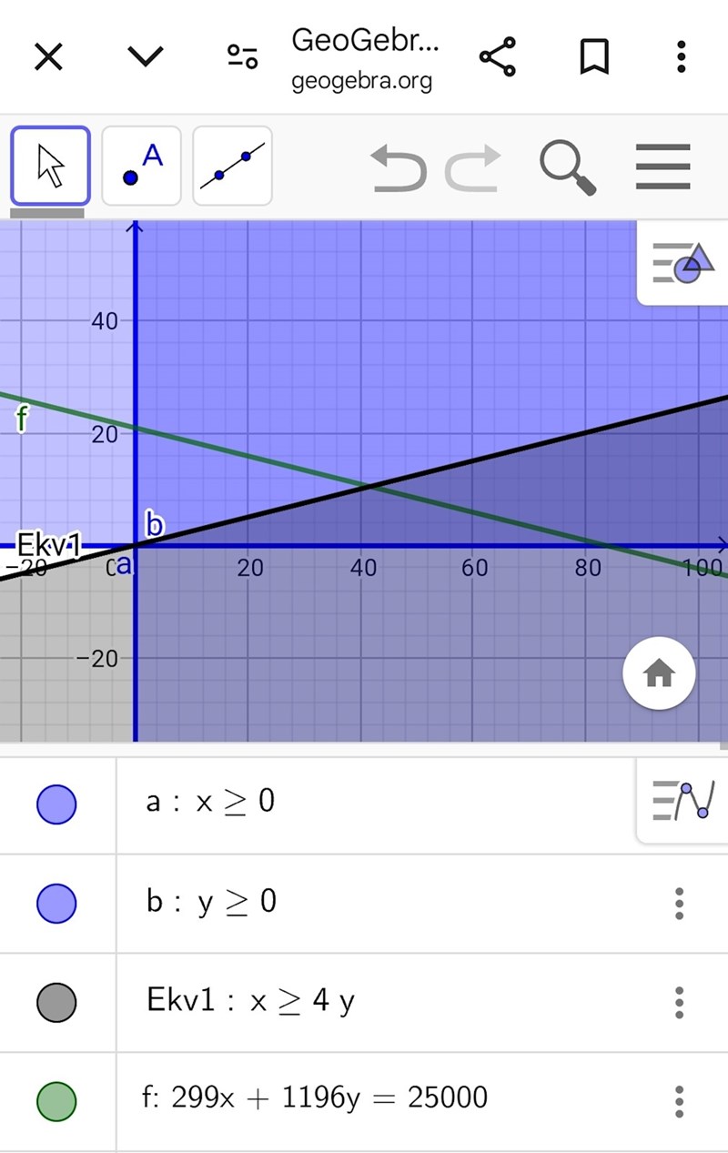 Hej jag undrar hur jag skriver ekvationssystem i grafritare. Uppgiften jag håller på med ska jag markera up ett område i ett koordinat system och området är lite jobbigare att göra på papper pga de nummer som är involverade, så jag vill undvika att göra det på papper. Delarna som ska va i systemet är: {x ≥ 4y}, {x ≥ 0}, {y ≥ 0} och {299x + 1196y = 25 000}.