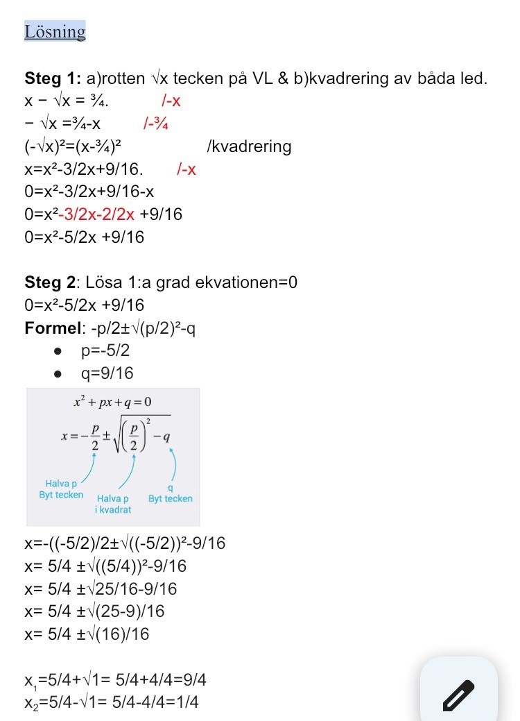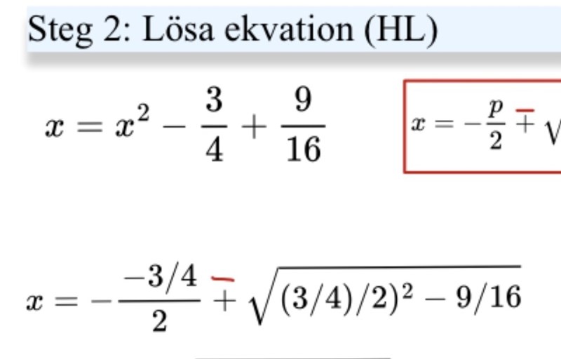 Om vi skriver om x\sqrt{x} som x1/2x^{1/2} och xx som x1x^1 så blir det tydligt: x1-x1/2=34x^1-x^{1/2}=\frac{3}{4}. Här är exponenten 1 dubbelt så stor som exponenten 1/2.