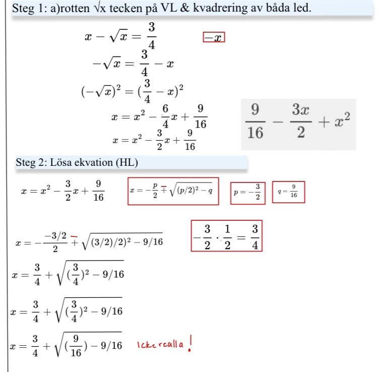 Sätt x=t\sqrt{x}=t. Då är x=t2x=t^2 och ekvationen kan skrivas t2-t=34t^2-t=\frac{3}{4}.