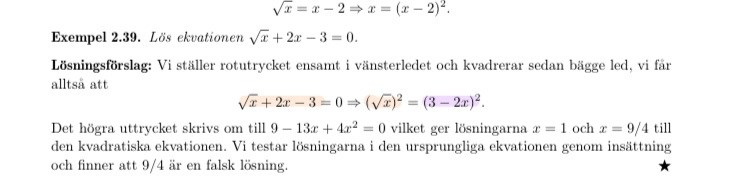 Nästa steg blir att kontrollera dina två lösningar och föra ett resonemang kring varför en av dem inte löser ursprungsekvationen.