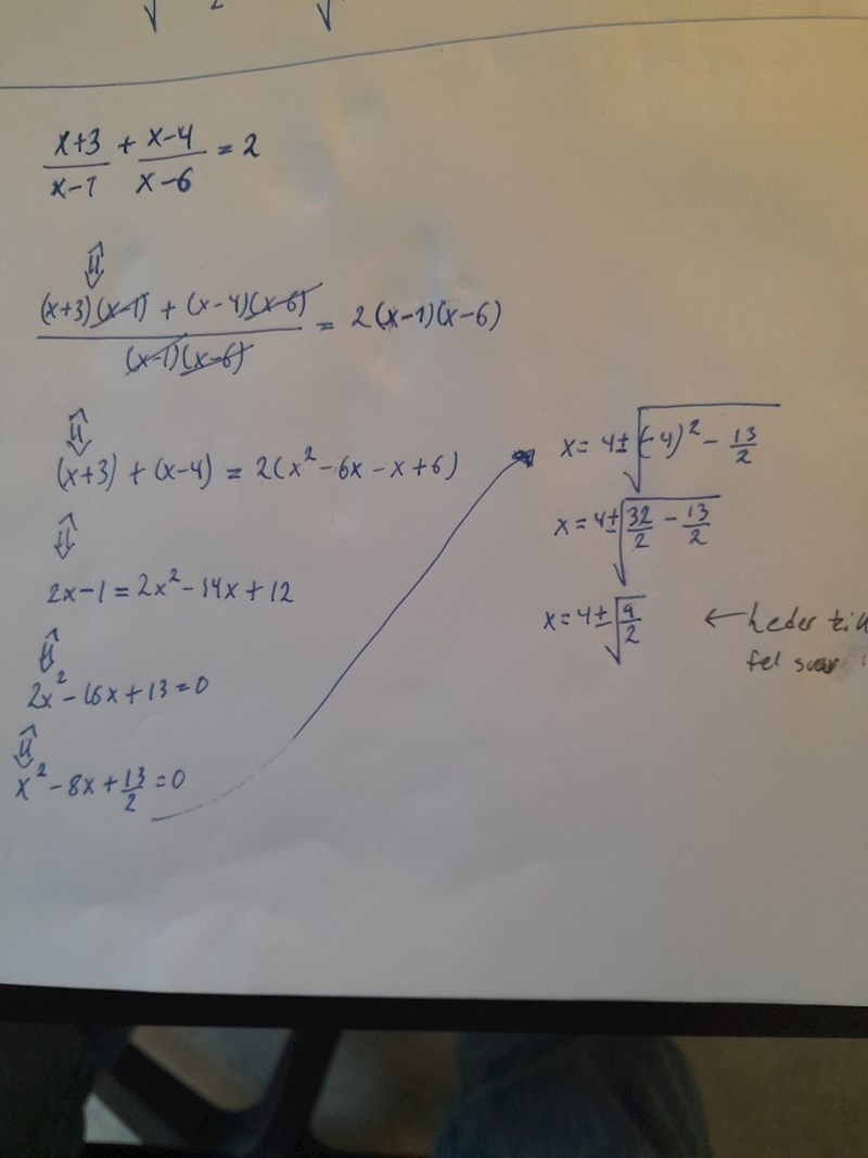 Multiplicera båda leden med (x-1)(x-6) så blir du genast av med alla nämnare.