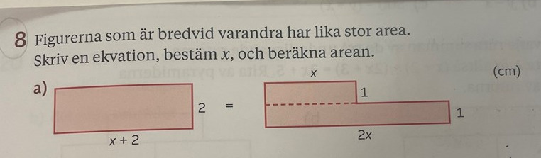 Hur stor area har den vänstra figuren? Skriv ett uttryck. Hur stor area har den högra figuren? Skriv ett annat uttryck. Det står i uppgiftstexten att figurerna har lika stor area, så ett uttryck = ett annat uttryck, du får alltså en ekvation. Lös den, så att du får fram ett värde på x. Då har du bestämt x och det återstår bara att beräkna arean.