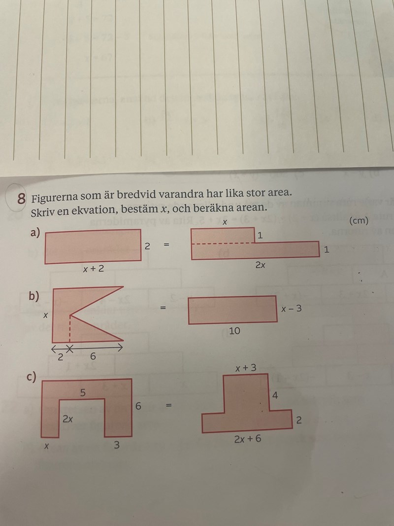 Greta.andersson89 skrev:Hej, hur löser jag uppgift a? Och vad menar de i frågan när det skriver ”bestäm x”?