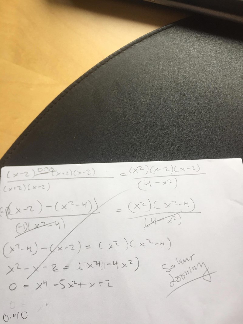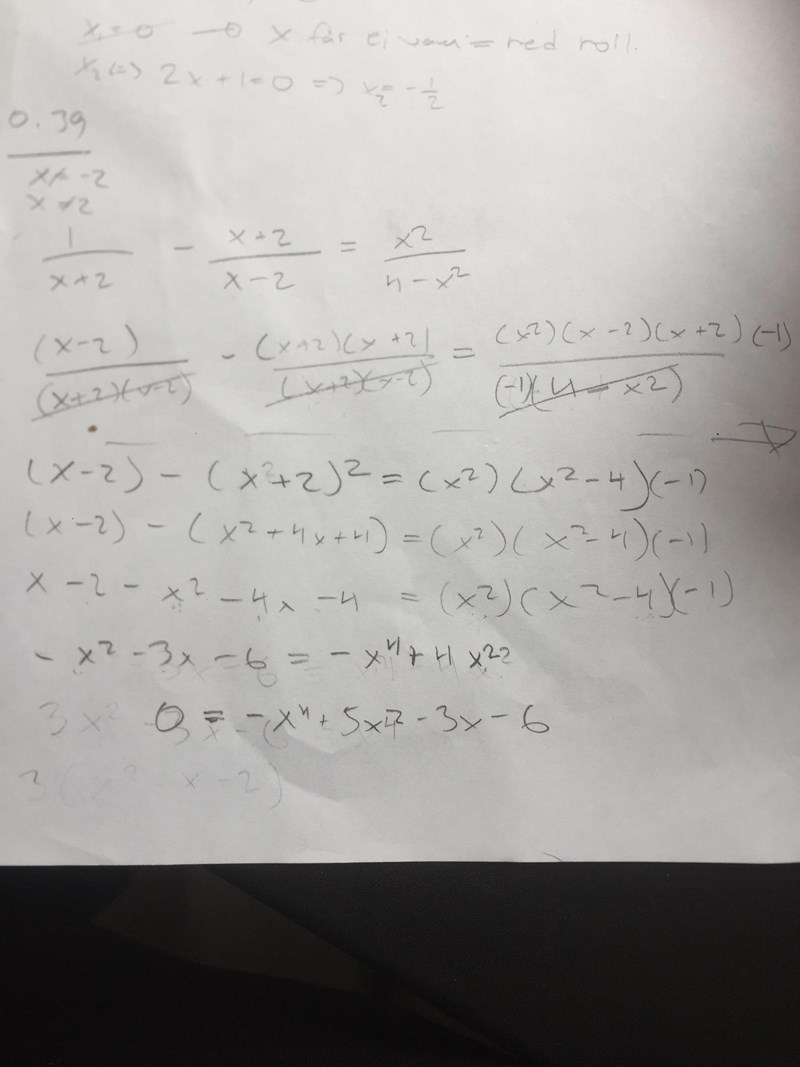 Hej, jag har i uppgift att lösa ekvationen ((1)/(x+2))-((x+2)/(x-2))=((x^(2))/(4-x^(2))).