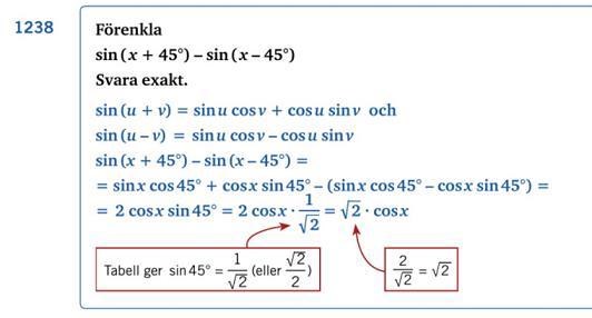 Jag följer med i förklaringen tills 2 cos x * 1/roten ur 2 blir roten ur 2 * cos x. Jag ser att de har en förklarande ruta angående vad sinus för 45 grader är, men i mitt formelblad finns inte roten ur 2/2 där. Hur blir 1/roten ur två samma som roten ur 2/2? Kan nån visa?