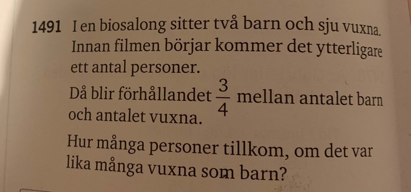 Hej, vet någon hur jag ska göra på den här? Och vad menas med att ”förhållandet” är 3/4 mellan antalet barn och antalet vuxna.