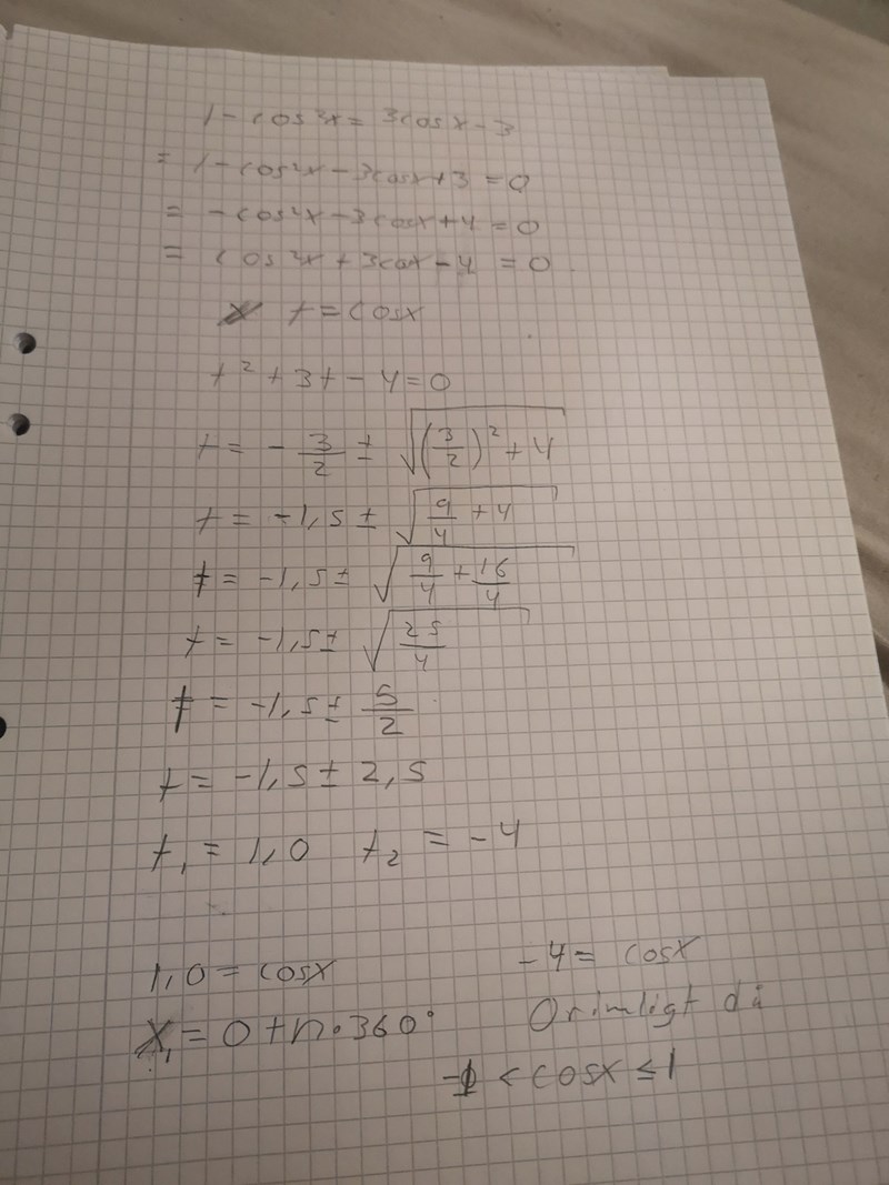Lös ekvationen: Sin^2x=3cosx-3
