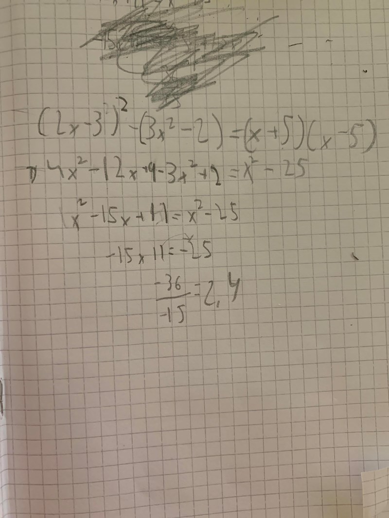 Jag ska lösa ekvationen som står högst upp, jag vet inte var jag kan ha gjort fel har försökt gå igenom men inte hittat felet. Facit säger att x ska vara 3