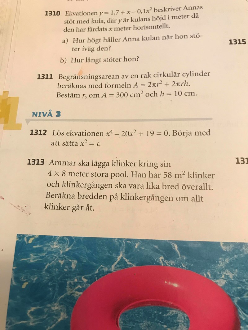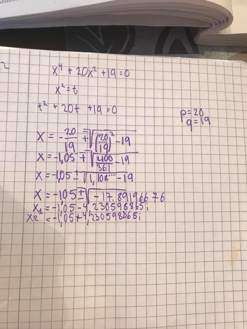 hej! Uppgift 1312. Jag är lite osäker på denna fråga. Vet inte riktigt hur man ska göra med X^4 då vi ej gått igenom det. Avsnittet jag är på handlar om PQ formeln så antar att det ska lösas på något sätt med PQ men då måste ju X stå som X^2 och inte X^4. Samt blir osäker på hur de menar med att man ska byta ut X^2 till T. Jag tolkade som att jag kan byta ut X^4 till t^2 isånafall med det kanske är fel?