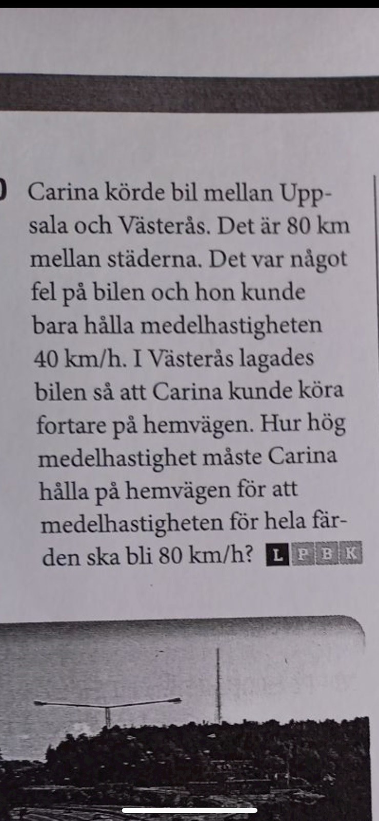 carina körde bil mellan Uppsala och Västerås. Det ät 80 km mellan städerna. Det var något fel på bilen och hon kunde bara hålla medelhastigheten 40 km/h. I Västerås lagades bilen så att Carina kunde köra fortare på hemvägen. Hur hög hastighet måste Carina hålla för att medelhastigheten för hela färden ska bli 80 km/h?