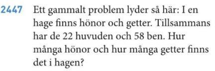 Den här uppgiften tycker jag är mycket enklare att lösa utan ekvationssystem. Om alla djuren hade varit hönor, skulle vi ha haft 22 huvuden och 44 ben. Nu har vi 14 ben extra. Det räcker till att "förvandla" sju hönor till getter genomatt ge dem två ben till vardera. Alltså har vi 22-7 = 15 hönor och 7 getter.