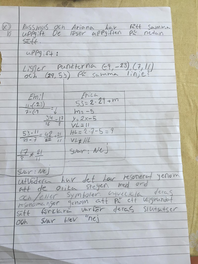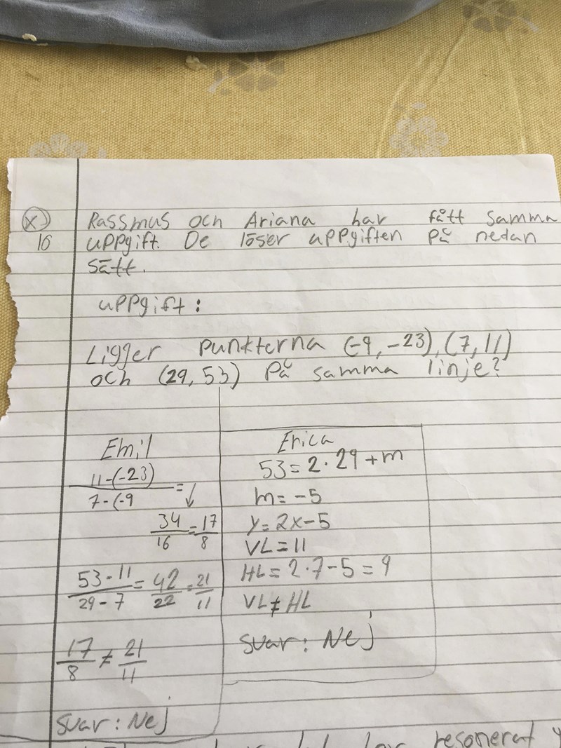 Min rekommendation är att du försöker lösa ursprungsuppgiften utan att titta på Emils eller Ericas anteckningar och att du sedan jämför dina slutsatser med deras.