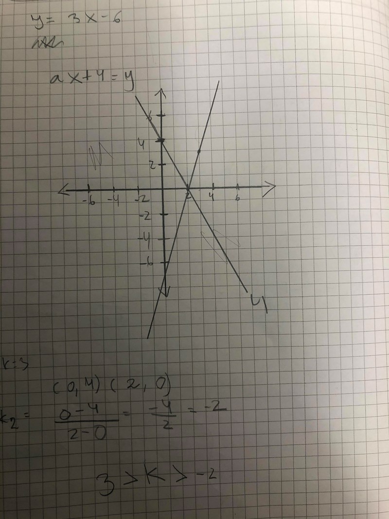 3 är k värdet för grafen y=3x-6. Hur ska man tänka?? Jag kan förstå att linjerna måste skära varandra i 4:de kvadranten. Har jag svarat rätt?