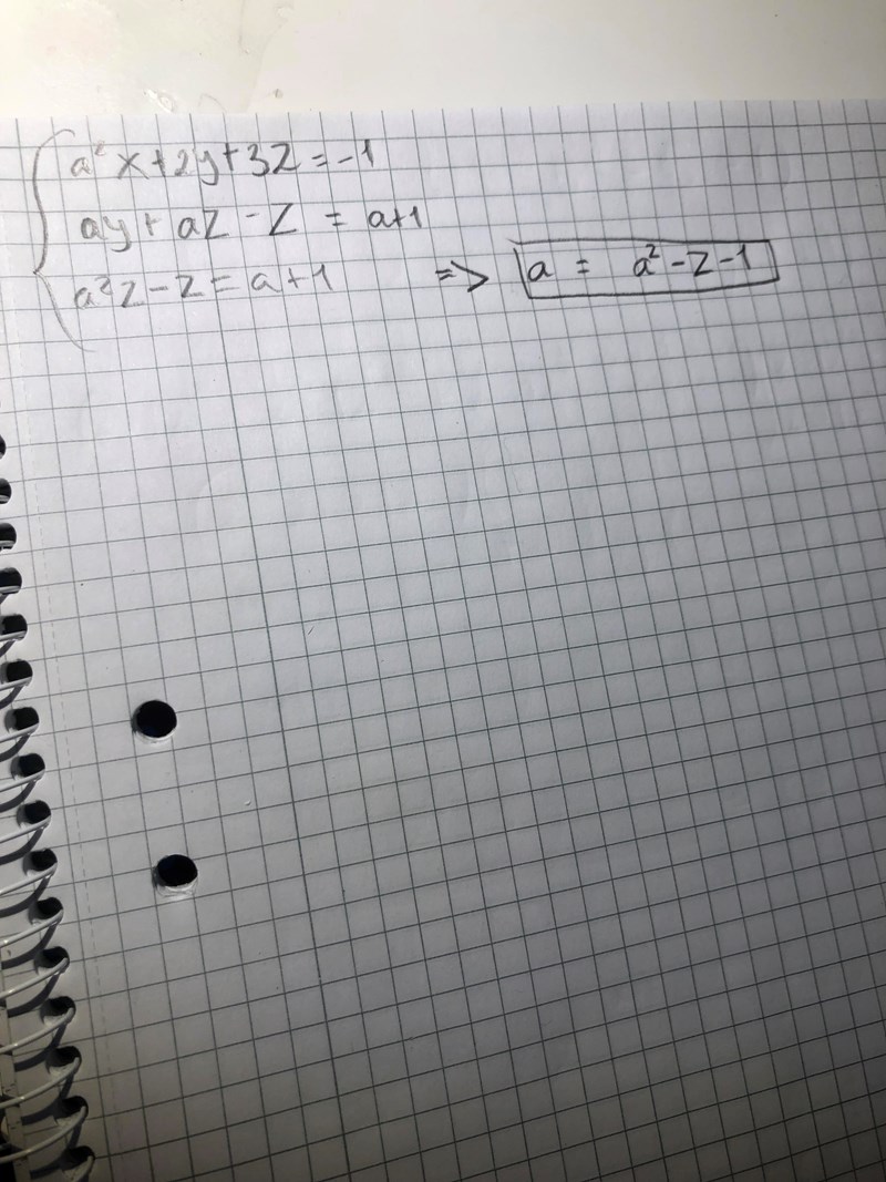 Du skall lösa ut x,y,z genom additionsmetoden. Prova att multiplicera den andra ekvationen med -(a^2-1).