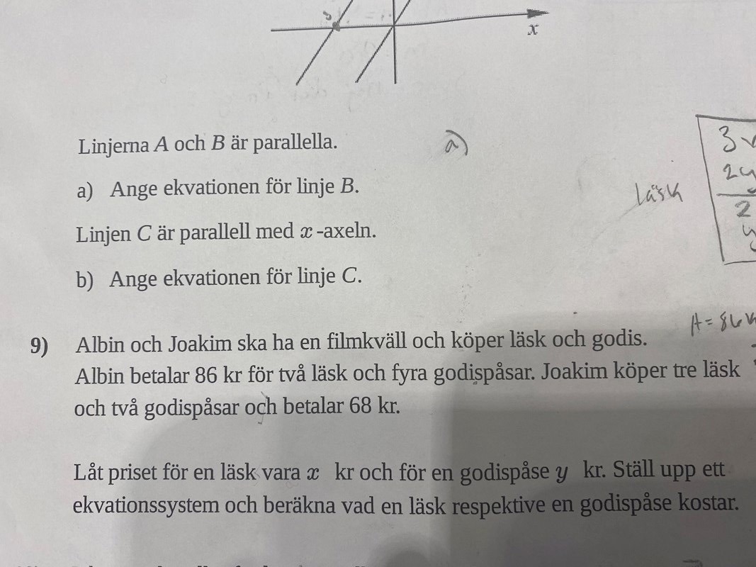 Två läsk och fyra godispåsar kostar 86 kr. Vad kostar fyra godispåsar?
