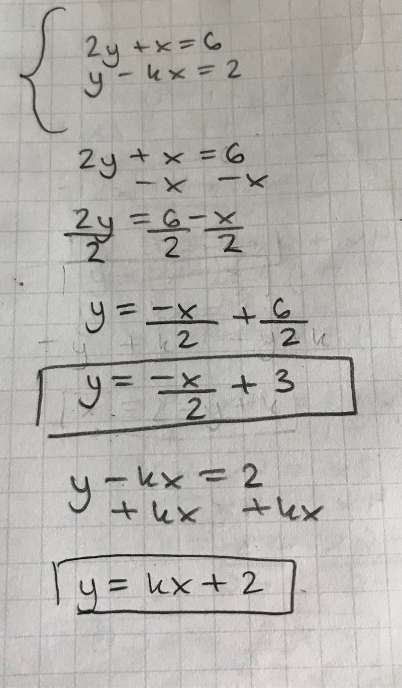 Som jag sa tidigare så är m-värdena olika, vi har m-värdet 3 på den första och m-värdet 2 på den andra, men det spelar väl ingen roll för det är k-värdet som måste vara olika för att lösningen ska ha exakt en lösning. Då kan man väl ta ekvationerna som vi hade från början y = -1/2x + 3 och y = kx+2, eller hur?