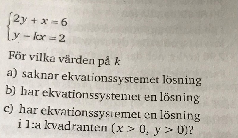Du kan välja ett värde på k som gör att lutningen är lika, d v s att linjerna är parallella (= ekvationssystemet saknar lösning). Vilket värde på k är det?
