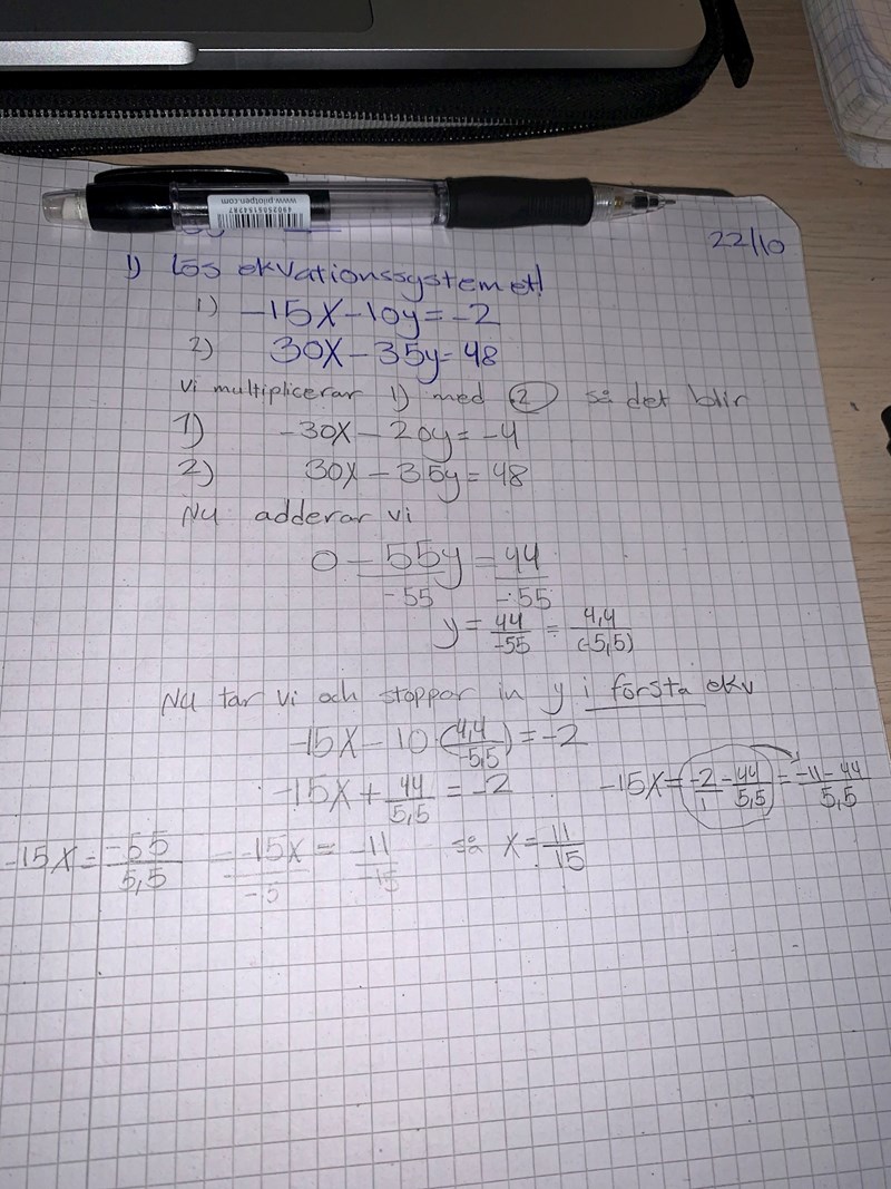 Jag tappar bort mig när jag ska kolla slutet. Jag föreslår att du skriver y som -4/5 (för det går att förkorta bort faktorn 11) och fortsätter därifrån.