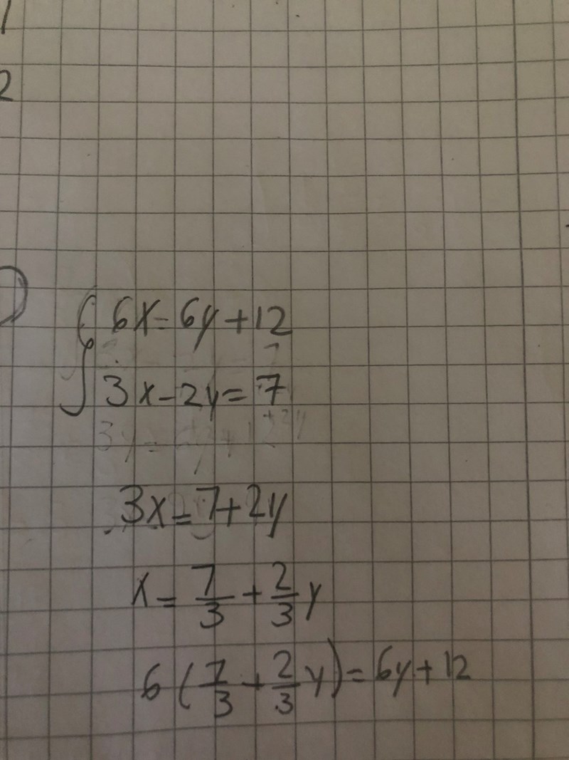 Du vill "bli av med" alla x eller y när du subtraherar ekvation ett från ekvation två. Du vill alltså subtrahera bort 6x och då måste du ha lika många x i ekvation två. Det får du om du först multiplicerar den med 2. Kom ihåg att du måste göra samma saki båda vänster och höger led.