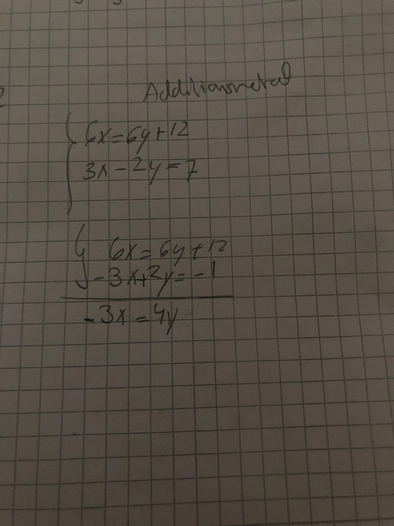 OK, då kan du t.ex. multiplicera hela ekvation 2 med 2 och sedan subtrahera den ekvationen från den andra "ledvis", typ så här: