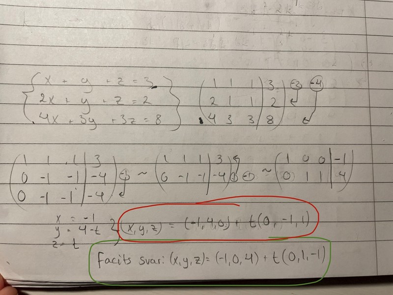 Jag får fel svar när jag löser ekvationssystemet. Det röda inringade är mitt svar, det gröna är facits svar. Vad gör jag för fel??