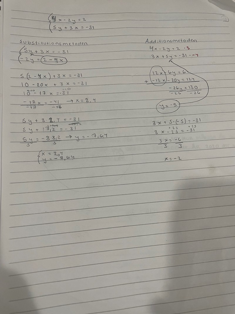 Då ser du att du räknat rätt när du använder additionsmetoden. Eftersom du vet hur man löser ekvationerna med substitutionsmetoden, så hittar du nog misstaget själv, men du har att -2y = 2-4x och borde ersätta y med -1+2x