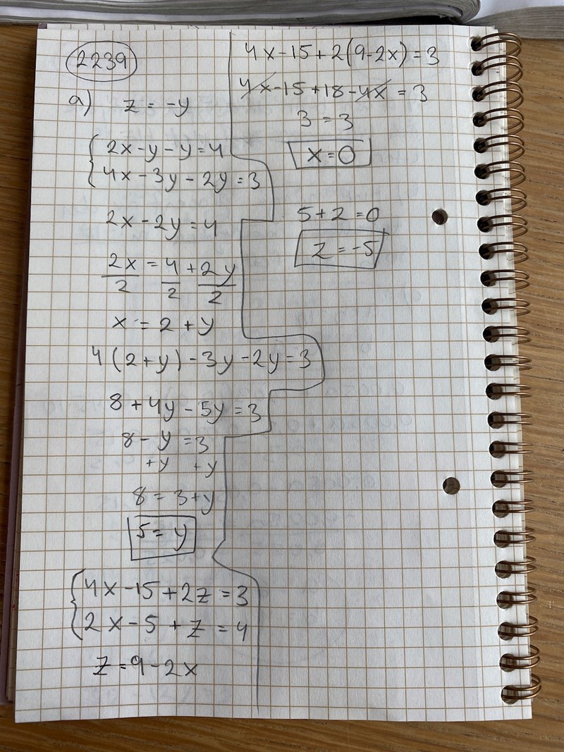 Du har använt 4x-15+2z=3 och fått z=9-2x. Stoppar du in z=9-2x i 4x-15+2z=3 så får du inget nytt.