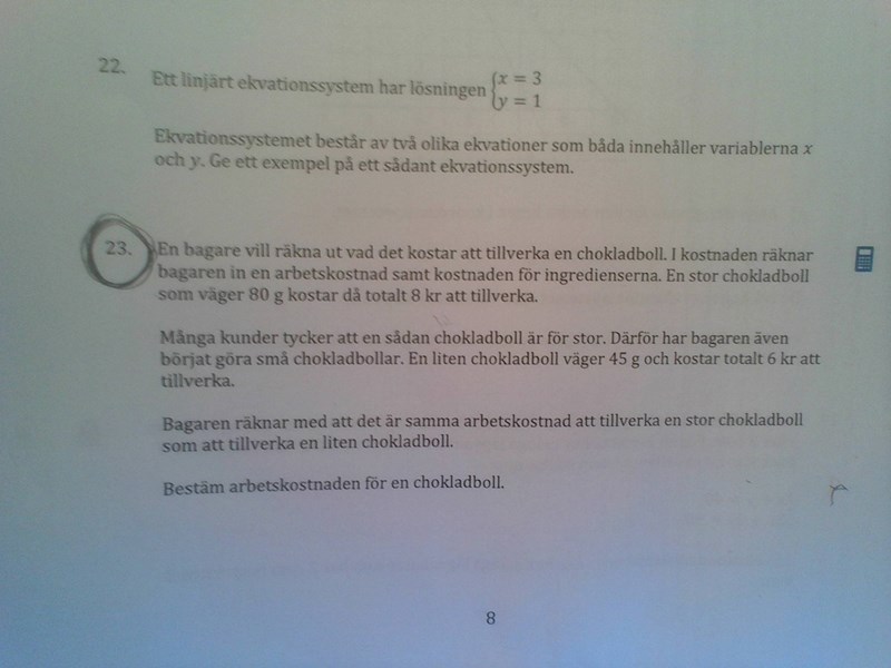 jag tänkte något i stil med 80(x+y)=8 och 45(x+y)=6 där x är kostnaden för ingredienserna och y för arbetet men det känns som om nåt inte stämmer.