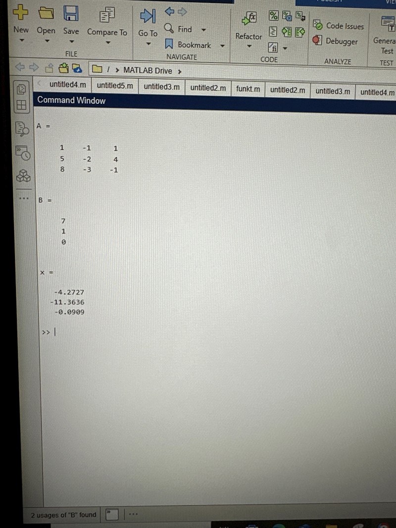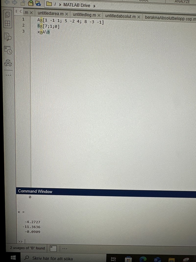 Matlab har säkert bättre sätt att lösa linjära ekvationssystem. Googla lite! Det här var bara min spontana lösning och det var 30+ år sedan jag använde Matlab. (Jag är dock lite nöjd över att mitt A\B från skoltiden fungerade.)