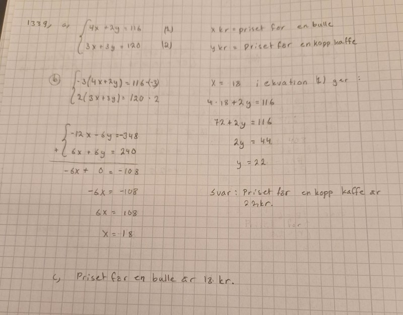 Subtraherar men den andra ekvationen från den första får man x=18 direkt.