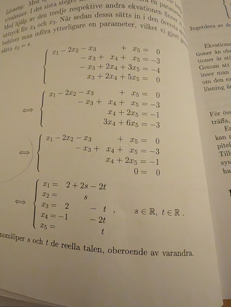 Undrar hur man kommer fram till sista raden där ifrån näst sista? Har ingen aning om hur det går till. Hur ser man att x3= 2 eller x4 = -1. Vad är t och -2t? Vad är s?