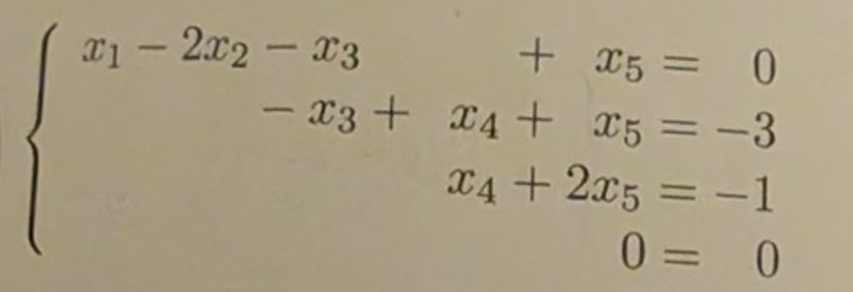 Vi har 3 (oberoende) ekvationer men 5 variabler vilket gör att vi får "hitta på" värden för 2 av dem och de väljer x_5 och x_2; x_5=t och x_2=s. Då har vi endast kvar 3 okända (x_1, x_3 och x_4) och med de 3 ekvationerna kan vi bestämma dessa. De kommer att innehålla x_5=t och x_2=s, men det är OK.