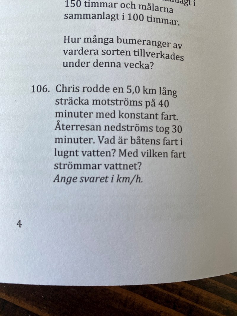 Bedinsis skrev:Då Chris ror medströms finns det en fart som kommer av att han ror, b, och en fart som kommer av att strömmen drar båten framåt, h. Då dessa samverkar har båten den totala hastigheten b+h.